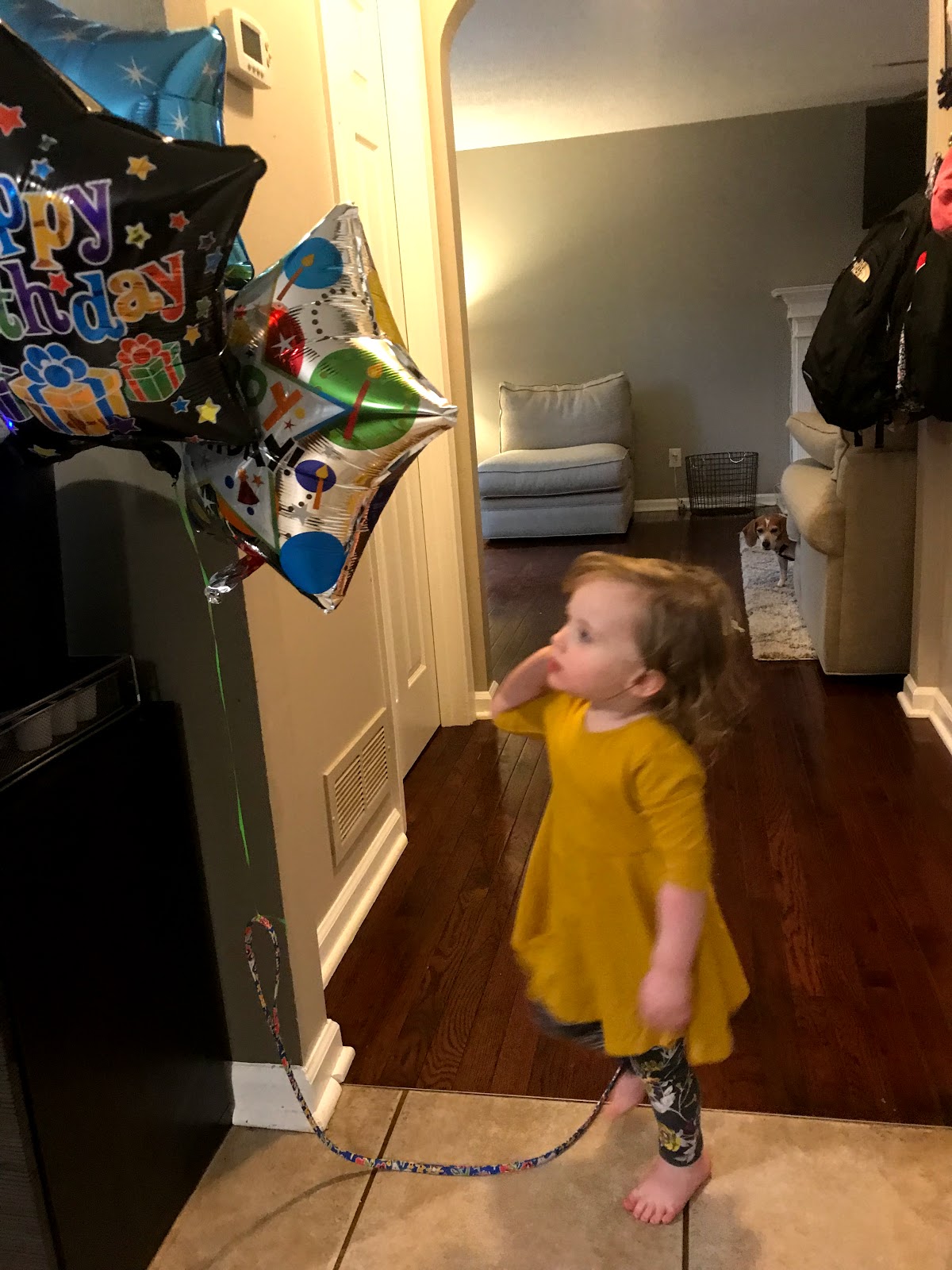 Auntie Paige and Uncle Cody sent her an edible arrangement with balloons! (That we had to tie to the dog leash so she would stop letting them float to the ceiling, haha!)
