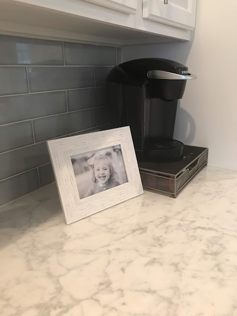 -Redid the back splash to a subway tile that sometimes looks white, sometimes blue, and sometimes green, ha!